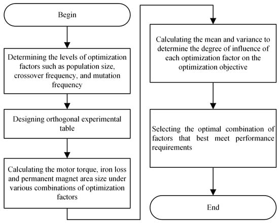 The genetic algorithm simulates the biological evolution process by introducing concepts such as competition, crossover, selection, mutation, and reproduction to select individuals that are suitable for the environment from the population for genetic operations and obtain the individual with the best adaptability to the environment as the optimal solution [21]. Compared with other algorithms, the genetic algorithm is more widely applicable, simpler to operate, and has better optimization results; thus, it is widely used in motor optimization design [22]. However, it also has certain drawbacks, such as a slow convergence speed and the need for a lot of trial and error in parameter tuning. To address this issue, this paper proposes a multiobjective optimization design algorithm based on the hybrid Taguchi method and genetic algorithm. The basic idea of this algorithm is to use the Taguchi method to set the running parameters in the GA optimizer based on the genetic algorithm optimization. The Taguchi algorithm has the advantages of a simple operation and fast computation speed, while the genetic algorithm can be used to handle complex nonlinear problems and has a good global search capability. The combination of the two can improve the efficiency and accuracy of the optimization solution.