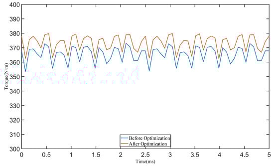 After building the final electromagnetic design and creating an Ansoft simulation model, the values of the motor torque, iron loss, and efficiency were calculated at an input current of 220 A and a rated speed of 3000 rpm. The performance indicators before and after optimization were compared. As shown in Table 5 and Figure 10, it can be seen that, after the optimization of the genetic algorithm, the average output torque increased by 1.65%, the motor efficiency increased by 4.73%, and the material usage of permanent magnets was reduced by 2.21%. The optimized motor model meets the efficiency requirements for ship-use motors while reducing the amount of permanent magnets used and improving the economic efficiency of ships.