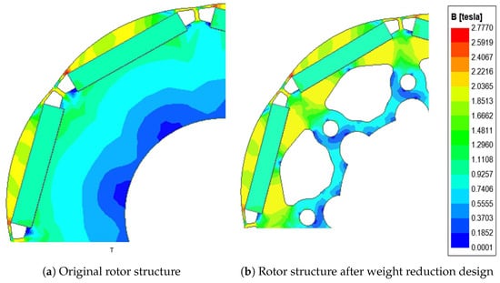 After the algorithm optimization, the rotor laminations of the motor are designed with weight-reducing holes to improve the power density. A reasonable selection of the shape and position of weight-reducing holes can reduce the weight, optimize the magnetomotive force distribution, and increase the motor’s heat dissipation area without changing the motor’s performance. The improved and original motors were simulated, and the unloaded magnetic flux distribution of the rotor was obtained, as shown in Figure 11. It can be seen that there is little magnetic density variation in the area near the axis, and the weight-reducing design enhances the magnetizing effect of the embedded rotor structure, reducing the magnetic leakage in the motor. After comparing the motor performance before and after adding the weight reduction holes, Table 6 shows that the rotor weight was reduced from 19.71 kg to 11.18 kg before and after optimization, and the no-load counter-electromotive force and average torque did not change much.