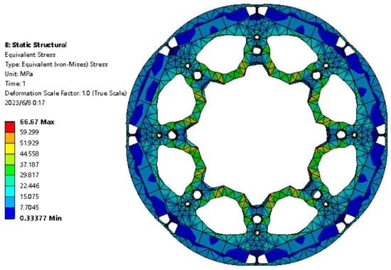 As shown in Figure 12, the maximum stress on the rotor is 66.67 Mpa when the rotor rotates at a maximum speed of 8000 rpm, which is much smaller than the yield strength of the silicon steel material (330 Mpa). It can be seen that the stress and deformation of the rotor caused by centrifugal force are much smaller than the strength limit of the corresponding material when the motor is running, and the equivalent stress and deformation displacement are within the safe range. Therefore, the rotor is not in danger of fracture, and it can be determined that the design of the rotor can ensure the normal operation of the motor.