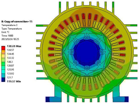In this study, we established a 2D model of the motor and conducted a transient thermal simulation using ANSYS Workbench to investigate the temperature change of the motor after operating under a constant load for 30 min and then being turned off. To better simulate the actual working conditions, we set the initial environmental temperature at 56 °C and the convective heat transfer coefficient to 15, taking into account the effect of convection. The distribution of the motor temperature rise after 30 min of simulation is shown in Figure 13. The copper wire is the part with the highest power density in the motor, so its temperature rise is also the highest, reaching 138.69 °C. The temperature rise then gradually decreases from the air gap to the rotor and reaches 119.57 °C at the motor shaft. The temperature distribution contour map shows that the motor’s temperature rise is still relatively high. The motor’s insulation is designed to be F-class, so there is still some margin in the winding’s ability to withstand such temperature rises.