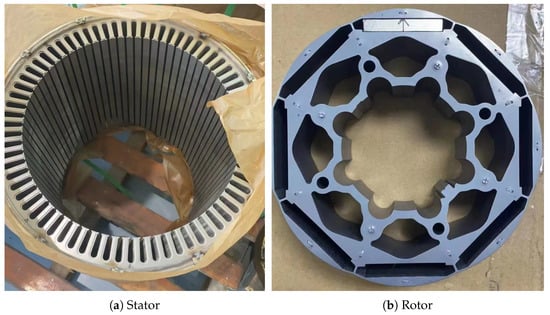 After the weight reduction hole design, a prototype of a 100 kW stator and rotor, as shown in Figure 14, was produced based on the optimized final solution. In order to verify the performance of the permanent magnet synchronous motor under actual working conditions, torque-efficiency testing was carried out on the motor, and an experimental platform for motor drag testing was built as shown in Figure 15. The experimental testing platform is mainly composed of load motors, test prototypes, torque sensors, and other experimental equipment, where number 1 in the figure corresponds to the tested prototype, number 2 corresponds to the torque sensor, and number 3 corresponds to the load motor.