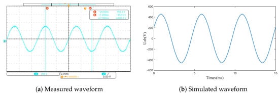 In the back electromotive force test, the prototype was three-phase open-circuited, and a load motor drove the prototype to rotate through the coupling, running at the rated speed of 3000 rpm. In the experiment, the high-voltage differential probe was used to read the induced EMF of the AB phase of the prototype into the oscilloscope for data processing, obtaining the measured back EMF waveform. As shown in Figure 17, the comparison with the simulation results indicates that the test data are basically consistent with the simulation results, verifying the accuracy of the simulation calculation.