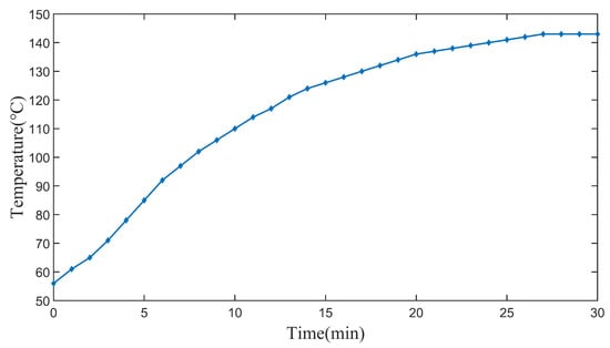 The temperature variation of the test motor winding was measured by the resistance method, and the curve is shown in Figure 18. At the beginning of the experiment, the winding temperature was about 56 °C. As the working time of the motor increased, the winding temperature gradually increased until it reached a near-equilibrium state after 30 min, with a temperature of 143 °C. Thereafter, the temperature change was not significant, indicating that the motor had reached a thermal equilibrium state. Since the insulation level of the motor was F-class, the maximum allowable temperature was 155 °C, so the winding temperature rise was within the allowable range.