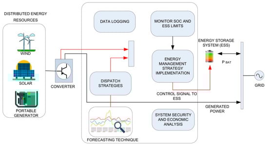 - Energy Storage Systems (ESSs): ESSs are used to store energy generated by DERs during off-peak hours or when there is an excess supply of energy. The stored energy can be used during peak hours or when the DERs are unable to generate enough power. ESSs are typically batteries or flywheels that can store energy in the form of electrical or mechanical energy, respectively [3,28].