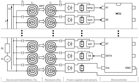 The schematic of an exemplary measurement system of sensors (temperature, humidity, sunlight, etc.) with a communication module (TR) and a microcontroller (MCU), powered by a mobile energy source (Us, Rs) using a wireless power transfer (WPT) with resonant coils (Lc, Cc).