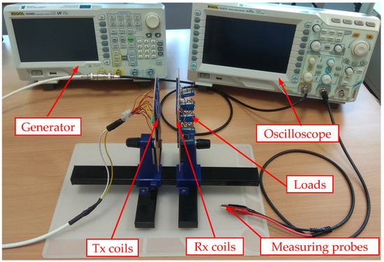 The model in Section 2.2 was verified using the experimental stand. The circular planar coils were wound and connected to capacitors. A procedure that was adopted relied on creating B = 18 identical coils, measuring their self-inductances and matching individual capacitors to each of them in order to obtain one desired resonant frequency fc, according to Equation (4). As energy receivers (RB/2+1 ÷ RB) variable resistors were used, helping to adjust their resistance and test their influence on the WPT efficiency.