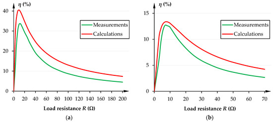 On the experimental stand, it was additionally measured that the resonant frequency was at a frequency of 576 kHz at the distance dz = 5 mm, and at a frequency of 550 kHz at the distance dz = 10 mm, while the designed resonant frequency was 500 kHz. In both cases analysed, the shape of the characteristics obtained from measurements and calculations was maintained. The power transfer efficiency of the WPT system increased as the load resistance increased, and then began to decrease after reaching the maximum value. At the distance dz = 5 mm, the maximum efficiency value obtained by the measurements was 33.65% with a load resistance of 12.5 Ω, while the maximum efficiency value obtained by the calculations was 40.47% with a load resistance of 10 Ω (Figure 5a). The greatest difference in the WPT system efficiency results obtained by the measurements and calculations (about 15%) occurs at low load resistance values and decreases with increasing load resistance (it does not exceed 3%). At the distance dz = 10 mm, the maximum efficiency value obtained by the measurements was 12.73% with a load resistance of 7 Ω, while the maximum efficiency value obtained by the calculations was 13.36% with a load resistance of 8 Ω (Figure 5b). The maximum efficiency of the WPT system was thus reduced by about three times. The greatest difference in the WPT system efficiency results obtained from measurements and calculations (about 4%) occurs at low load resistance values, while the smallest difference (less than 0.5%) occurs at the load resistance for which maximum efficiency was obtained.