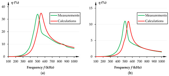 The influence of the frequency of the source voltage over a frequency range of 100 kHz to 1000 kHz with a load resistance of 50 Ω, on the efficiency of the WPT system, was analysed. This part compares the results of calculations and measurements of the WPT system, at the distances dz = 5 mm (Figure 6a) and dz = 10 mm (Figure 6b).