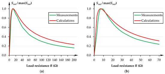 The power transferred to the loads was in fact an active power, due to the resistive nature of the energy receivers, and it varied depending on the load resistance and frequency. Furthermore, the multi-coil and resulting multi-coupling nature of the WPT system complicated the theoretical analysis, where analytically finding the optimal load resistance (maximizing the output power) became much more difficult. In order to determine the variation of the output power (Sout) with the load and frequency, the maximum achievable value of Sout and the adjustment of the load resistance, the characteristics (Figure 7 and Figure 8) from the measurements and calculations are presented in this section.