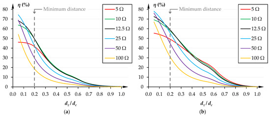 The outcome was as expected: efficiency decreased with increasing distance, but for dz/dc > 0.5, there was a sharp decrease in all cases, where, at dz/dc = 1, the values approached zero (Figure 9). For dz > min(dz), the highest efficiencies were found for the previously identified optimal resistances, i.e., 10 and 12.5 Ω. Interestingly, near dz/dc = 0.2, and then for dz/dc > 0.3, the efficiency for R = 5 Ω was higher than for R ≥ 25 Ω. However, below min(dz), higher resistances (R ≥ 25 Ω) gave higher efficiency. Furthermore, for f = 550 kHz, the all-present increase in power transfer efficiency (η) was noticed (Figure 9b). To conclude, in a real application, it would be better to use an operating frequency as close as possible to the real resonance point, and relatively small load resistances to maximize the η. In the fabricated system, the load can even vary from a few to several ohms, and still, at any practically useful distance, a similar efficiency will be achieved.