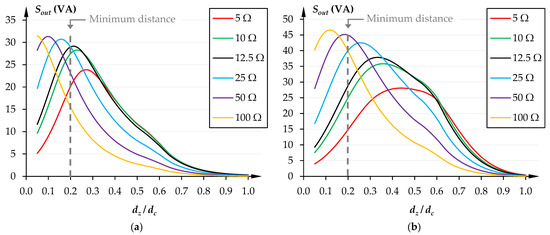 The load power also varied with distance; at that time, the function was not monotone (Figure 10). Maximum values were found at certain specified dz/dc; however, for R ≥ 50 Ω, the peaks appeared below min(dz). For dz/dc > 0.3, only smaller loads were able to provide more power. If both the efficiency and output power must be maximized, the load must be noticeably lower than 50 Ω. This opens the possibility of using the proposed solution for effective fast charging; since resistance is a scale factor between voltage and current, a low-resistance energy receiver means a load powered by a higher current (crucial in fast charging systems).
