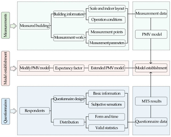 Measurements were performed to obtain the parameters to establish the thermal comfort model. A questionnaire was administered to obtain actual field feedback. This study centered on the thermal comfort model for the spectator area in ice rinks in winter. The framework of the study is shown in Figure 1.