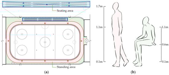 As the main objects of the field research were the rink’s spectators, the measurement instruments were placed in the seating area and the non-ice area outside the rink in different locations, and the measurement points were all close to the spectators. The rink measurement points were laid out in horizontal and vertical directions, as shown in Figure 4. In the horizontal direction, the seating area was measured using 5 points. There were 8 points in the horizontal direction on the outer side of the ice rink’s non-ice watching area. The east and west directions covered the watching area used by the largest number of spectators for the longest duration of stay. Each side was monitored using 3 points. The number of spectators on the north and south sides is relatively small, so only 1 measurement point was used for each side. Due to the poor visibility of the ice rink around the outside of the bend, few spectators choose these locations, so no measurement points were used there. In the vertical direction, spectators in the seating area remain seated, so data were collected at 0.1 m, 0.6 m, and 1.1 m in this area. In contrast, spectators in the non-ice area on the outside of the rink remain standing. Data were obtained from vertical measurement points at 0.1 m, 1.1 m, and 1.7 m from the ground in this area [48]. Data from different measurement points were collected every 30 min and the resulting datasets were used to calculate the PMV equation.