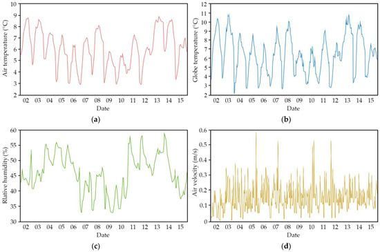 Indoor thermal environment variation curves: (a) air temperature; (b) globe temperature; (c) relative humidity; and (d) air velocity.