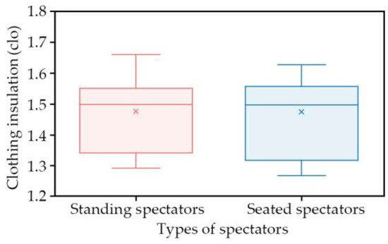 The questionnaire of the details regarding clothing checklists was developed based on ASHRAE Standard 55. Details regarding clothing checklists in the field were obtained by calculating the clothing insulation of the subjects at that time. Using the data of clothing insulation listed in ASHRAE Standard 55, the complete clothing ensemble could be determined. The insulation of the clothing of the two groups of spectators ranged from 1.32 clo to 1.56 clo, with an average value of 1.48 clo (Figure 6). The metabolic rates in the study were estimated approximately using ASHRAE Standard 55. According to the activity of the spectators, the metabolic rates of the seated spectators was 1.0 met and that of the standing spectators was 1.2 met.