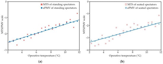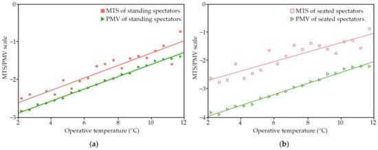 PMV and MTS curves for standing and seated spectators: (a) MTS and PMV of standing spectators; and (b) MTS and PMV of seated spectators.