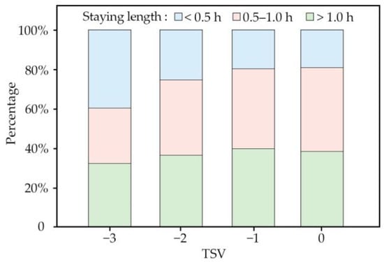 The frequency with which spectators left and re-entered the rink in this study varied. People who left and re-entered the rink more frequently may have developed physiological and psychological adaptations to the internal environment after long-term exposure to the same environment [57]. The analysis of the questionnaire data on the spectators’ duration of stay in the rink showed that the actual thermal sensation of people who stayed in the rink for a long time was higher than that of the spectators who stayed in the rink for a short time (Figure 9). Long-term exposure to an environment often reduces the body’s sensitivity to that environment [33], in turn influencing expectations of the thermal environment. A prolonged duration of stay caused the spectators to physiologically develop certain adaptations, although these could not be easily measured and quantified directly, causing a shift in the subjects’ expectations of the thermal environment [58] and influencing their thermal sensation votes.