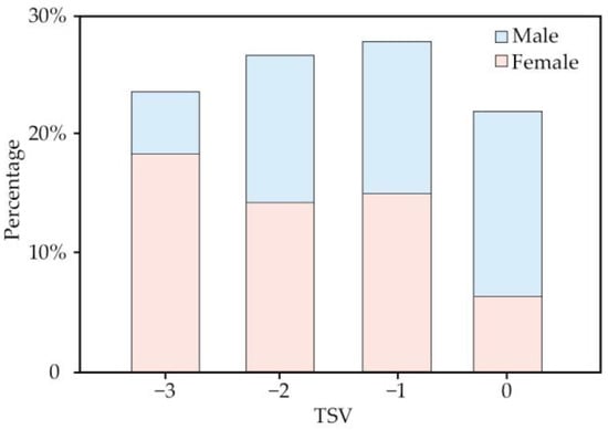 Individual factors may also affect thermal sensation. Differences in individual factors such as the subject’s age [59], gender [60], and weight [61] may also have led to differences in the findings. According to the results of the questionnaire, the average age of the respondents was concentrated between 30 and 40, the average height was about 1.60–1.70 m, weight was distributed in the range of 53–64 kg, and the majority of the spectators were female, with men representing only 45.6% of the respondents. All these factors may have influenced the statistical results. Taking the gender difference in individual factors as an example for in-depth analysis, the statistical results of heat-sensation voting by gender are shown in Figure 10. Female respondents’ percentage of “cold” thermal sensation votes was significantly higher than that of the male respondents. Men’s percentage of “moderate” thermal sensation votes was significantly higher than that of women. Women generally perceived the environment to be colder than men did. The data suggested that women preferred warmer environments and men were more adaptable to cold environments. The gender difference in thermal comfort demand was similar to that in the experimental investigation of Lan et al. [62]. Thus, according to the data obtained from the field questionnaires, the calculated range of the operative temperature and neutral temperature might be more suitable for female spectators, as the dominant group in this study.