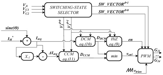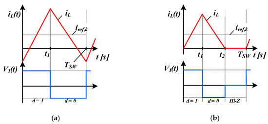 Different operation scenarios are possible during inductor’s current zero crossing: (1) bipolar voltage switching during the whole switching period that allows maintaining of the continuous current mode (CCM) and (2) bipolar voltage switching with a high-Z state period after the current drops to zero value. The latter considers the discontinuous current mode (DCM) in the inductor and thus is preferable. The reason is that the proposed CSC method inherits an accumulated volt-second error effect, resulting in current shape degradation during the CCM period [32]. Instead, the DCM operation allows resetting of the volt-second error during the current zero crossing, ensuring the current starts from the zero point in the following switching cycle, which helps to maintain a sinusoidal shape of the grid current (see Figure 3). It is obvious that the shorter the CCM period, the smaller is the accumulated volt-second error; as a result, the impact on the sinusoidal shape of the inductor’s current is negligible.