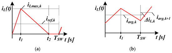 The magnetisation period during CCM can be calculated from Equation (6), where t2 is replaced with Tsw. The integration of the inductor’s voltage within a single switching period during CCM allows estimation of the end value of the current with respect to the starting point. Taking into account that the peak-to-peak value of the current remains almost constant between neighbouring switching cycles, the difference between the end value and the starting value is almost equal to the difference in the reference current between the neighbouring switching cycles (∆Iavg,k). Then the transistor’s control signal can be defined as follows: