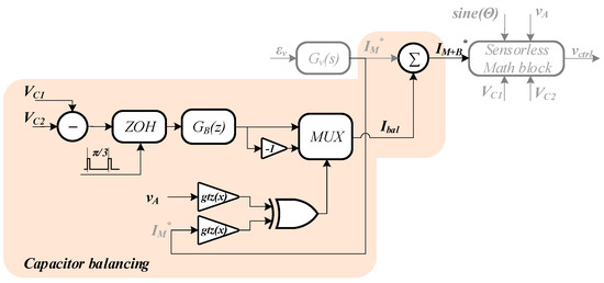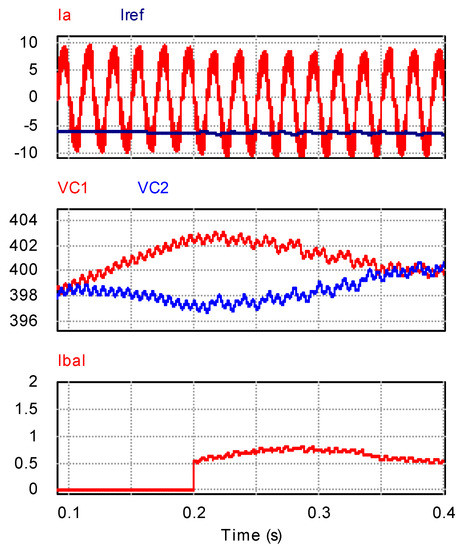 The capacitor voltage balancing was implemented by means of an additional PI controller. It monitors the voltage difference six times per grid period, when the capacitors’ voltages should have identical values in the balanced condition. In the case of voltage error, it passes through the PI controller and the resulting extra current amplitude is added to the main reference value. The sign of the balancing current amplitude is modified according to the power direction flow and grid voltage polarity. Finally, the simulation analysis, where a 2.5 kOhm resistor was connected in parallel to capacitor C2, demonstrated an ability to compensate for the voltage asymmetry equal to 5 V in 0.15 s.