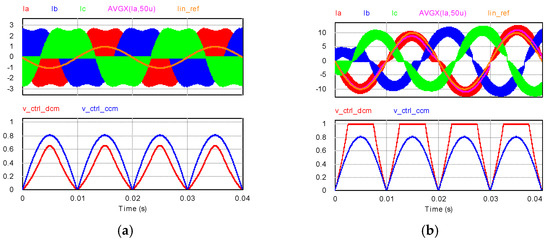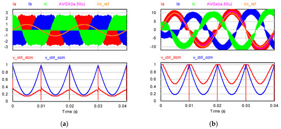 The rectifier mode was evaluated at two reference values: 1 A and 10 A. The first case (see Figure 9a) has DCM during the full input voltage period, shown by the bottom graph, where the DCM control signal has a lower value than the CCM control signal within the full grid period. Nevertheless, the average inductor current seen on the top graph perfectly matches the reference sinusoidal signal.