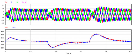 Simulation results of step response with the bidirectional power flow (x-axis is time [s], top graph y-axis is 3-phase current and A-phase reference current [A], bottom y-axis is capacitor voltages [V]).