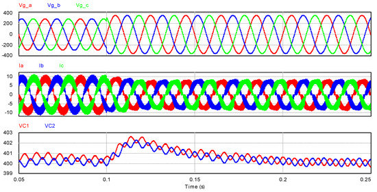 The simulation parameters are as follows: grid voltage (RMS) VG = 230 V; grid frequency fAC = 50 Hz; capacitor nominal voltages VC1, VC2 = 400 V; inductance La,b,c = 1 mH; capacitance C1, C2 = 4.7 mF; switching frequency fsw = 20 kHz.
