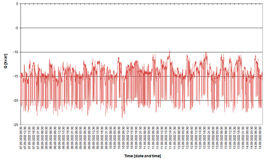 A summary of the analysis results of the active and three-phase reactive power levels generated by the agricultural biogas plant is shown in Figure 1 and Figure 2, respectively, while Figure 3 shows the corresponding power factor variation.