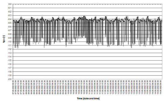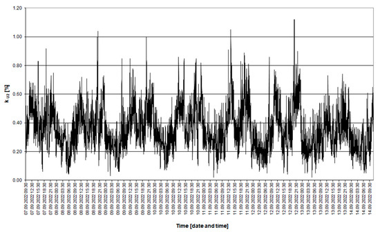Table 3 shows the descriptive results of the statistical analysis of the waveforms recorded at the agricultural biogas plant. The highest standard deviation value (expressed as a percentage of the mean value) was observed for the voltage asymmetry factor. This was primarily due to the fact that the value of this coefficient was mainly influenced by loads connected to the same line as the biogas plant, whose total variability in time was low. Above all, it is essential to draw attention to the high value of the maximum voltage distortion factor, which far exceeded the values permitted by European regulations. During such a high voltage distortion, malfunctions may occur in some types of equipment, especially those using rotating electromagnetic fields. Nevertheless, the duration of the exceedances during the recording week was short, as evidenced by the calculated mean and median values.