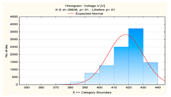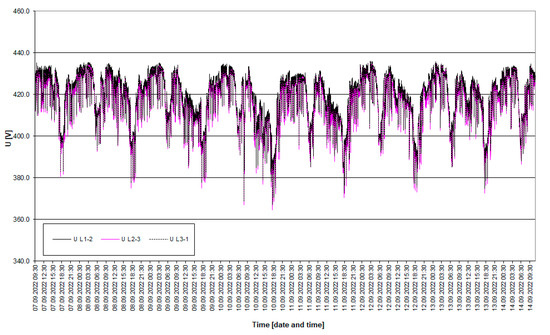 Analyzing the recorded voltage waveforms (Figure 5), it is possible to notice a cyclical pattern of changes in its values. The lowest voltage values occur when the power system experienced maximum loads (the afternoon peak). The statistical analysis (Figure 6) showed that for most of the recording time, the phase-to-phase voltage value was between 410 and 430 V. Voltage decreases were accompanied by voltage deviation values (Figure 7). The high variability of the recorded voltage values (from about 210 V to more than 250 V) can cause equipment malfunction sensitive to supply voltage changes. A solution to this problem can be provided by introducing energy through renewable energy sources when the lowest voltage occurs. As these are usually in the evening hours, a biogas plant that can produce energy regardless of the time of day and weather conditions would be the most effective for regulation.