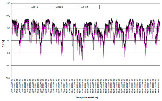 In the case of the waveform of the voltage asymmetry factor (Figure 8), certain repeatability can also be observed. The maximum values usually occurred in the afternoon, while the minimum was recorded during the night hours. An asymmetry in the voltage values in the individual phases is also noticeable (the recorded waveforms do not overlap). This can cause incorrect operation of some equipment (especially rotating machinery). Voltage asymmetry values were mostly between 0.2 and 0.6% (Figure 9) and were more than three times lower than the values required by European regulations.