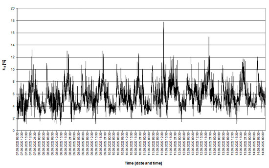 The asymmetry of the current generated in the biogas plant was more significant than the voltage asymmetry but, in most cases, did not exceed 12% (Figure 10), usually taking values between 4 and 8% (Figure 11). Such high values of current asymmetry were due to the amount of single-phase equipment installed and operating in the biogas plant (mainly water and gas pumps), causing phase load imbalance.