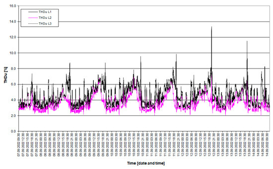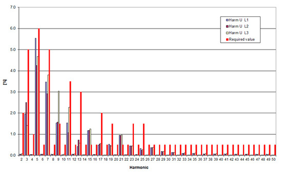 By comparing the voltage distortion of the waveform generated at the biogas plant to the sinusoidal waveform, it can be seen that the permissible values of the 9th, 15th and 21st harmonics (Figure 12) were not met. The total voltage distortion factor values recorded at the biogas plant (Figure 13 and Figure 14) also varied in the diurnal system, with minimum values occurring at night and peaks in the afternoon (usually around 3 p.m.). This was due to the operation of non-linear loads (drawing current from the grid distorted from the sinusoidal waveform) in the analyzed power system.