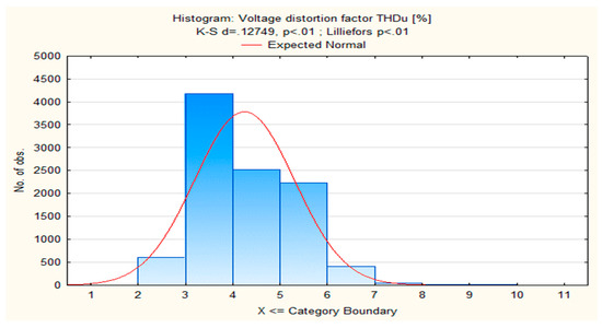 Distribution of total voltage distortion coefficient values recorded at the agricultural biogas plant under study.