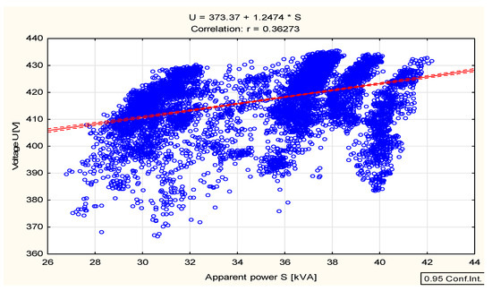 Figure 15, Figure 16, Figure 17, Figure 18, Figure 19 and Figure 20 show the correlation between the analyzed quantities describing the quality of the electricity generated at the agricultural biogas plant under study and the apparent power generated. As expected, voltage values were increased as the generated power increased (Figure 15). The low value of the correlation coefficient was mainly due to the occurrence of voltage drops during the operation of the agitator in the digester.