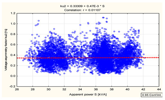 However, no correlation was observed between the voltage asymmetry factor values and the generated power (Figure 16). This means that the value of the short-circuit power at the point of connection of the agricultural biogas plant was sufficiently large that the generation of approximately 40 kVA (despite the current asymmetry registered at the biogas plant) did not affect the voltage asymmetry in the grid. Therefore, the over-recorded voltage asymmetry was an “incoming” asymmetry from the electricity grid and may have resulted from asymmetrical loading of the individual phases of the line to which the biogas plant under study was connected.