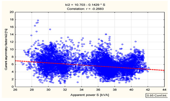 Correlation recorded at an agricultural biogas plant between the values of current asymmetry kI2 and apparent power.