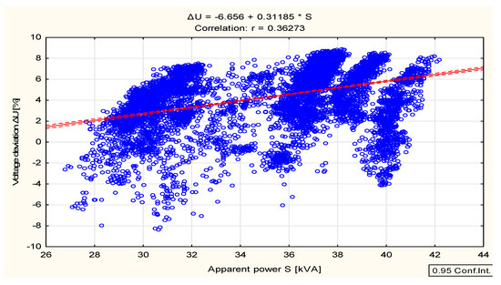 Correlation recorded at an agricultural biogas plant between voltage deviation values and apparent power.