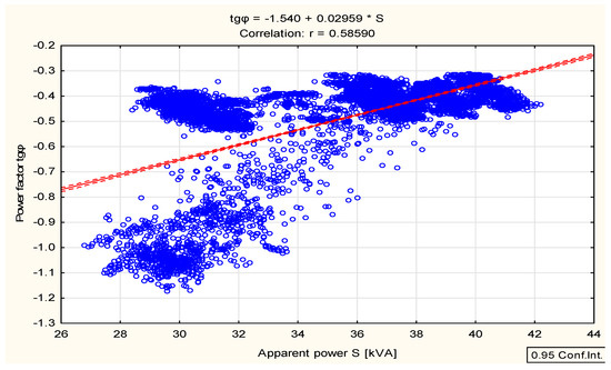 As expected, the correlation between the voltage deviation value and the power generated in the agricultural biogas plant (Figure 19) was the same as the corresponding correlation of the voltage values. The correlation was increasing. Similarly, the values of the power coefficient behaved similarly, clearly increasing with increasing apparent power generated (Figure 20). The significant reduction in the tgφ value (to nearly −1.2) was due to the operation of the digester mixer. When the agitator is not running, the tgφ is closer to the regulatory required values (−0.4). Even then, an apparent increase in the value of this coefficient can be seen as the generation in the biogas plant increased.