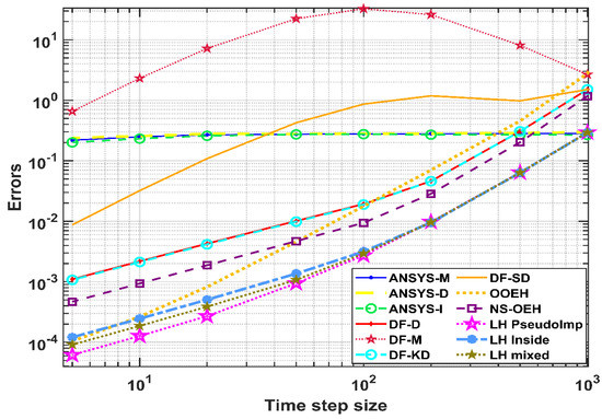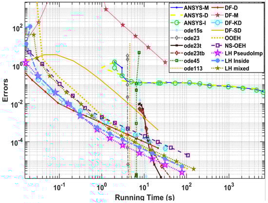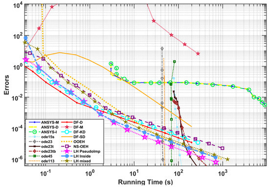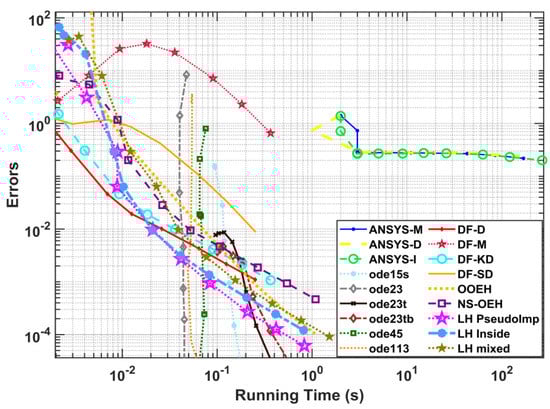 MATLAB solvers have been used for comparison purposes, namely ode15s, ode23t, ode23tb, ode23, ode45, and ode113. While implicit solutions are used for the other odes, it is known that odes 45, 23, and 113 employ explicit methods. Since the time step sizes cannot be calculated explicitly for the MATLAB solvers, we instead define the tolerances, beginning with a large value, such as until an extremely small minimum value, which is . We note that an additional solver, namely ode23s, is also available in MATLAB, but in our previous work [40,48], it is proved to be really slow for these problems; thus, we omitted it.