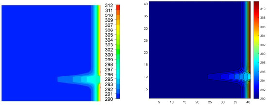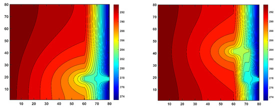 The temperature distribution contour in Kelvin units for the long-term simulation in the case of the medium mesh case (left) for straight thermal bridge and bent thermal bridge (right) at the end of the last day.
