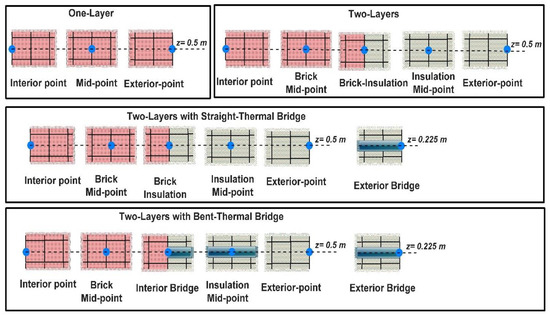 In Figure 15, we compared the temperatures of the external points of the two thermal bridges with the external points of the one- and two-layer cases. We concluded that the straight thermal bridge allows the heat to flow faster than the bent thermal bridge because the passage of heat in the bent bridge is longer than in the straight one.