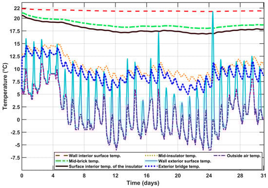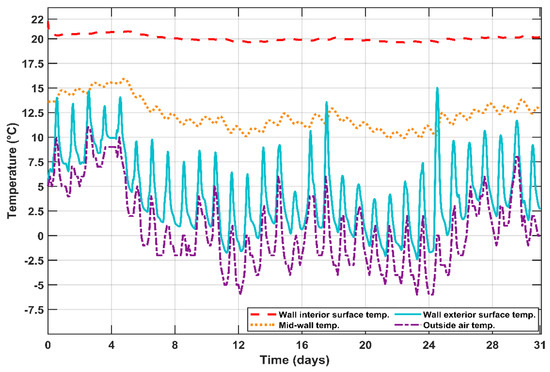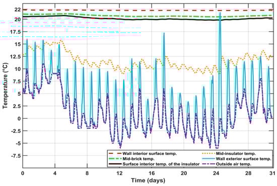 For the design of the heating load, we adopt the hardest weather conditions, and the design is based on them. Therefore, we will review the coldest day of the month, which is 25 January, where the lowest recorded temperature is −6 °C. We also applied the previous best methods to calculate temperatures and heat losses across the wall, but with a new time step size of s in this simulation, to track and record the temperature change every minute because the total simulation time here is short, only T = 24 × 3600 = 86,400 s. The temperature as a function of the hours of the day for the exterior points in all cases of the wall, and a comparison between the losses in energy on the coldest day of the month are presented in the Supplementary Materials (see Figures S10 and S11). One can see the largest losses in the case of one layer, and Table 7 contains the cost of energy consumption on this day.