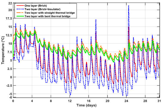 The temperature distribution in Celsius units with days for the long-term wall simulation in case of exterior points of thermal bridging (straight and bent) compared with one-layer and two-layer cases.