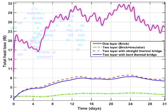 Figure 16 shows a comparison between the losses in energy. One can see the largest thermal loss in the case of a one-layer wall, and these losses are less with the presence of the insulator. When a thermal bridge is present, these losses are larger than without a thermal bridge, and the losses are slightly larger in the case of a straight thermal bridge than for the bent bar.