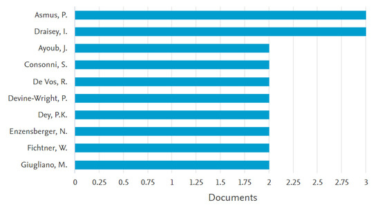 The most productive two authors are scarcely cited. For example, Asmus received only two citations, whereas Draisey was cited only once. The most cited authors are Walker and Devine-Wright. They published, as coauthors, two highly cited articles, which received a total of 738 citations. At this point, it is worth mentioning that the total number of citations received by all articles in the sample was 6.578. Thus, the above-mentioned authors collected 11.22% of all citations.