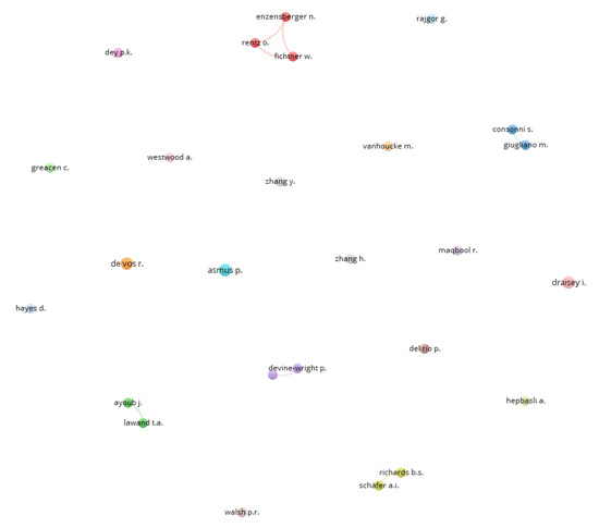 The analysis of the authors’ network was started by setting two documents as the minimum for an author, and it was shown that 26 authors met the threshold. The largest set of connected items consisted of three items, which included such names as N. Enzensberger, W. Fichtner, and O. Rentz (Figure 5). These authors published, together, two papers. Four pairs of authors coauthored one to two papers.