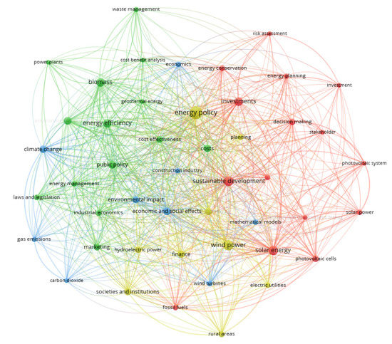 Cluster 1 includes such keywords as “decision-making”, “energy conservation”, “planning and utilization”, “fossil fuels”, “investment(s)”, “photovoltaic cells/system”, “research and development”, “risk assessment”, “solar energy/power”, “stakeholders”, and “sustainable development”. Cluster 2 includes such keywords as “biomass”, “costs”, “cost-benefit analysis/effectiveness”, “environmental protection”, “geothermal energy”, “industrial economics”, “laws and legislation”, “marketing”, “power plants”, “public policy”, and “waste management”. Cluster 3 consists of such keywords as “carbon dioxide”, “climate change”, “construction industry”, “economic and social effect”, “economics”, “environmental impact”, “gas emissions”, “mathematical models”, and “wind turbines”. Finally, Cluster 4 includes the following keywords: “electric utilities”, “energy policy”, “finance”, “hydroelectric power”, “planning”, “rural areas”, “societies and institutions”, “strategic power”, and “wind power”.